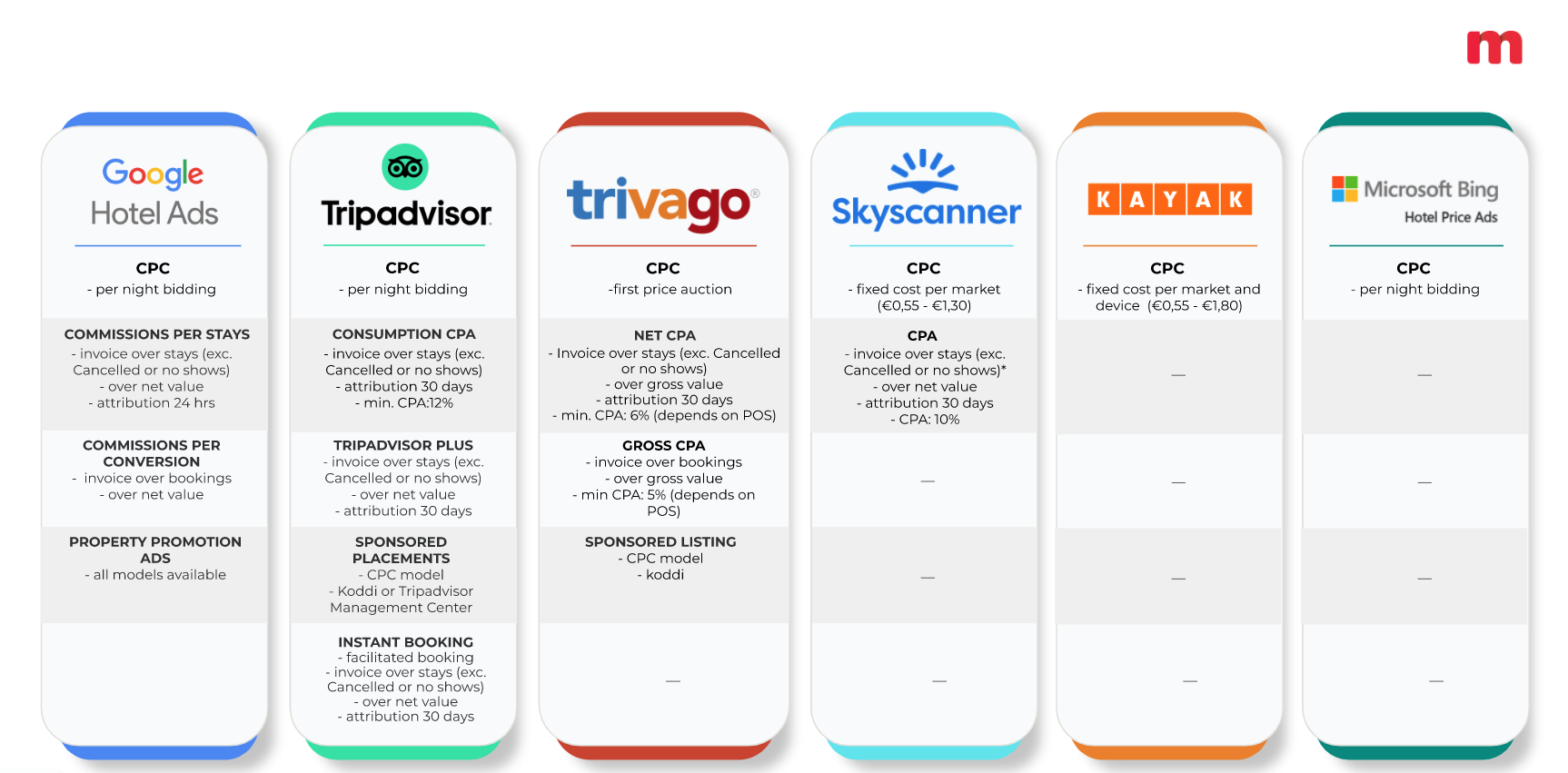 -- Metasearch : Google Hotel Ads (incluant Free Booking Links), trivago, TripAdvisor, Kayak, Skyscanner, Bing HPA…incluant un dashboard où