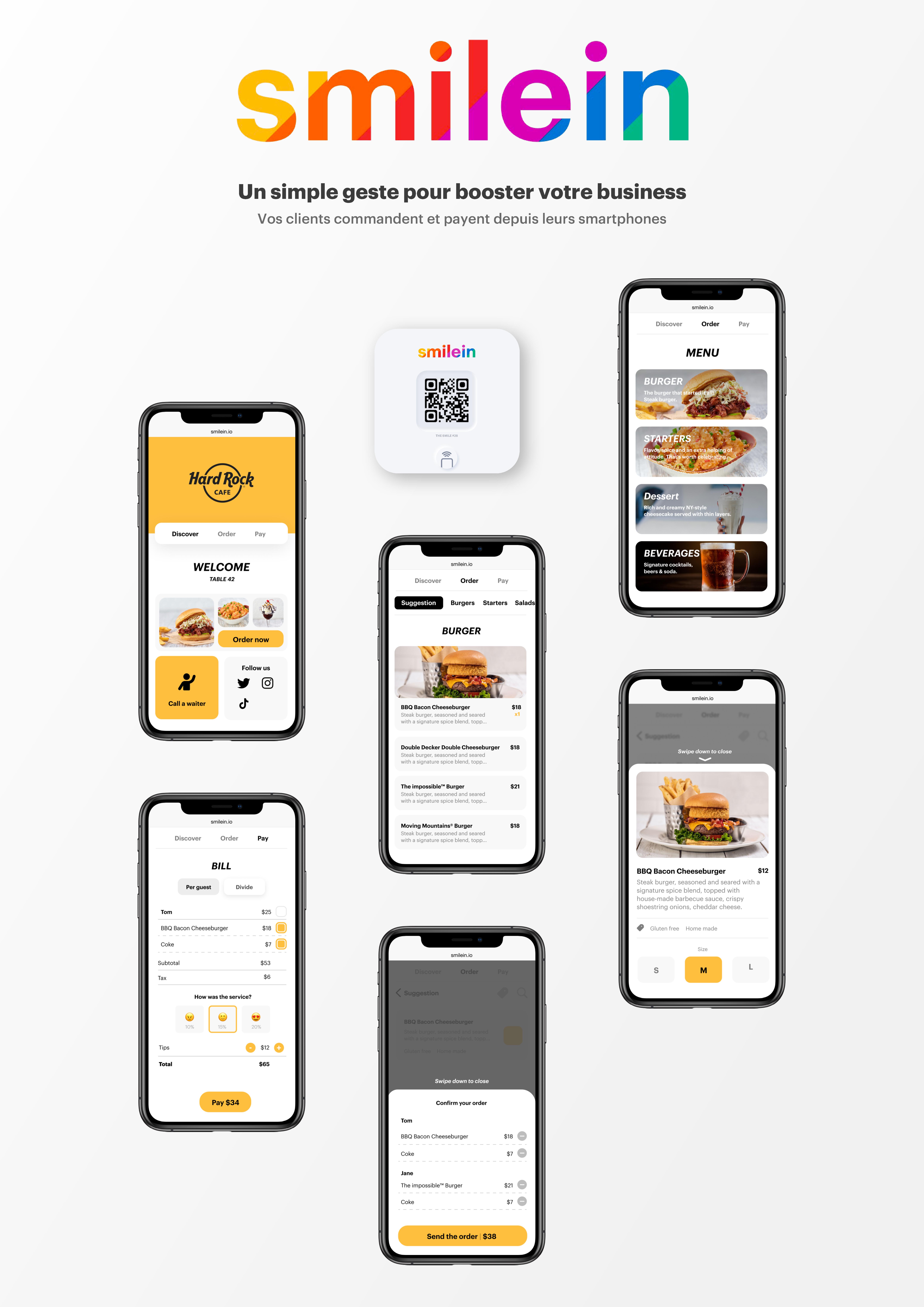 Smilein est une plateforme digitale, entièrement personnalisable, permettant aux restaurateurs et hôteliers d’offrir à leurs clients la commande et le paiement depuis leur smartphone sous ses diverses formes (service à table, retrait comptoir, click & collect) ainsi qu’un ensemble de services complet incluant la fidélisation, le divertissement (presses, jeux, réseaux sociaux...), la promotion des enseignes...