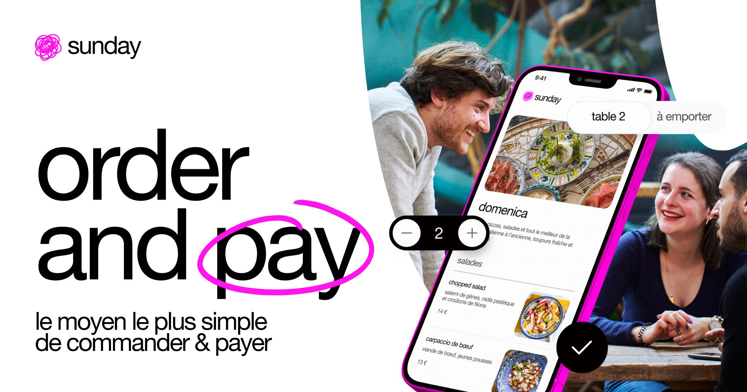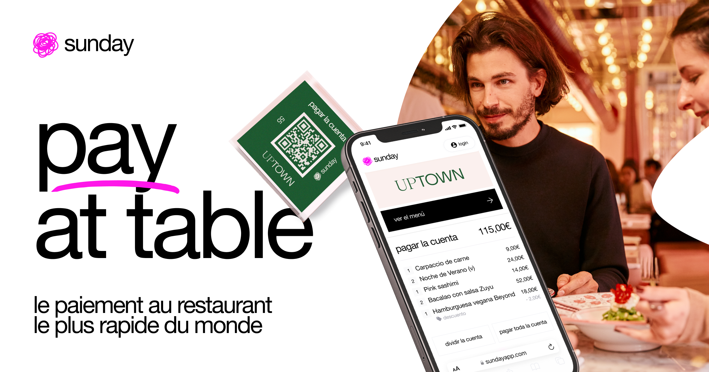sunday est la solution de paiement dédiée à la restauration qui permet aux clients de payer leur addition en moins de 10 secondes.