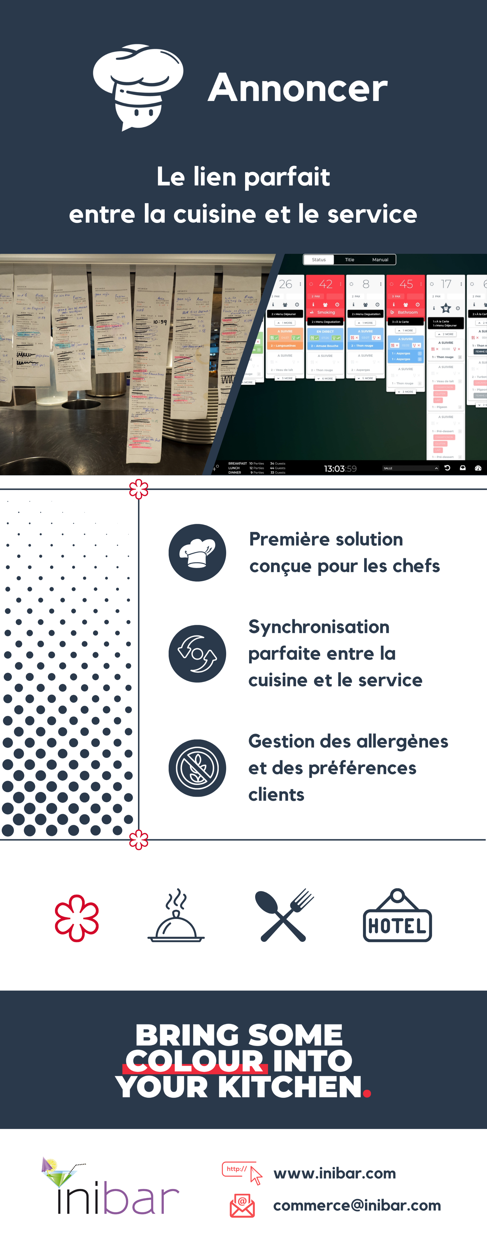 Lors du Food Hotel Tech 2025, Inibar est fier de présenter en exclusivité la solution Annoncer, une solution digitale performante de gestion de votre cuisine et de votre service, pensée pour répondre aux exigences opérationnelles des restaurants gastronomiques et des restaurants de grande taille. Annoncer n’est pas un seulement un KDS, c’est une solution complète pour gérer efficacement une brigade en cuisine. Annoncer optimise la communication entre la salle et la cuisine.